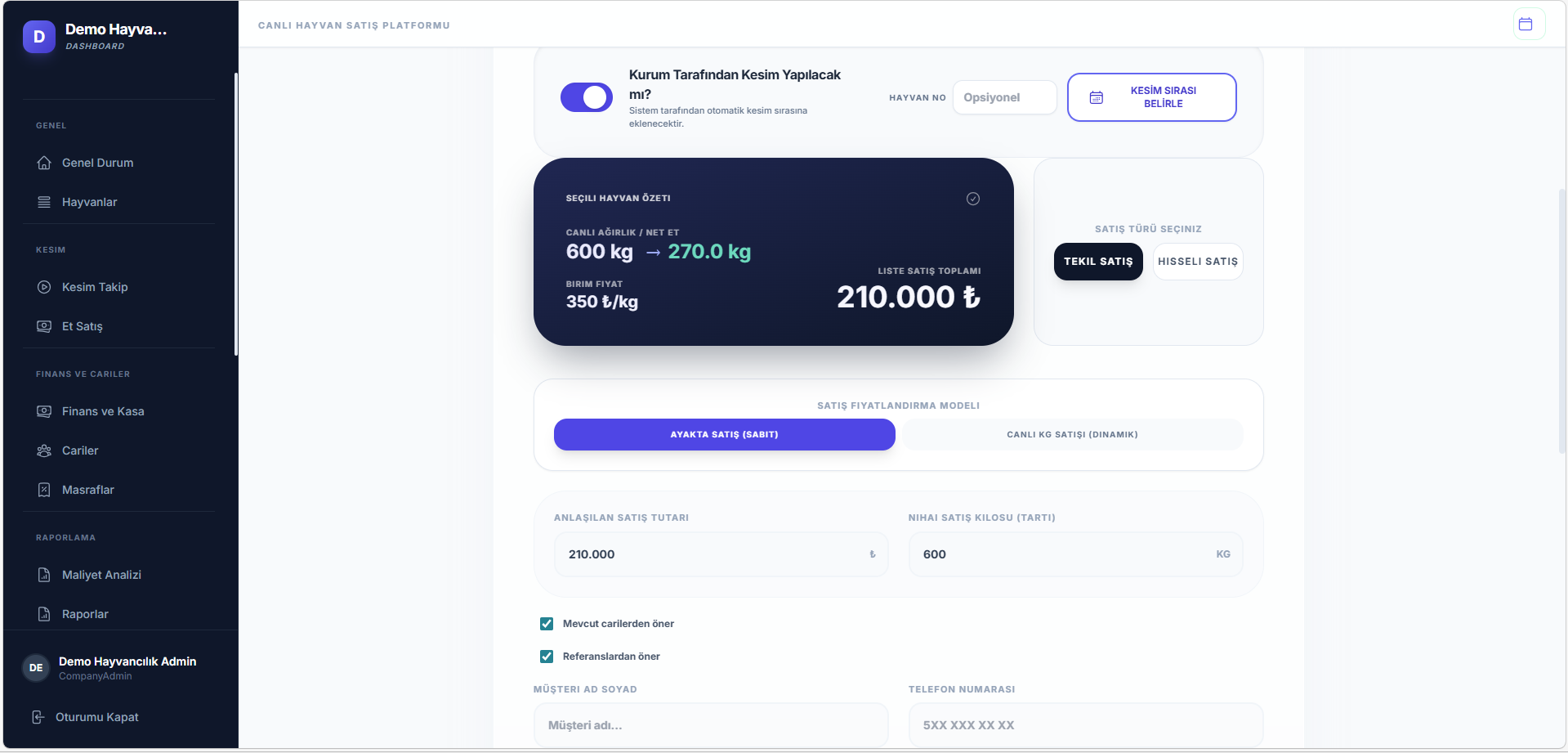 Ağırlık bazlı fiyatlandırma (Canlı Kg)